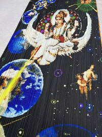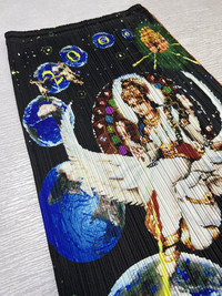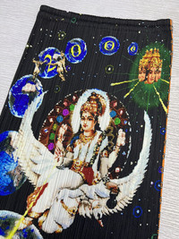 Issey Miyake - Pleats Please - Spring-Summer 2000 - Tadanori Yokoo Millennium Krishna Pleated Long Skirt Tagged Size: 4, fits 24-30” Gently Used Good Condition *Sign of Use(Dirts. Creases. Scratches.) Measurements in Inches(Laid Flat): Waist: 12” Hip: 14” Length: 37.5” Hem/Leg Opening: 17” Product Information: - A rare piece from the brand's early collection. A very rare vintage item from the 2000s. Issey Miyake in collaboration with Tadanori Yokoo: Tadanori Yokoo, an artist who has consistently led the times through constant change. In the Pleats Please Issey Miyake collaboration, Yokoo's overflowing energy is reconstructed within a single piece of fabric, presenting works that offer both the joy of viewing the garment and the pleasure of wearing it. Since the 1960s, Mr. Yokoo has created numerous stage art posters as a graphic designer. His style, characterized by bold compositions and vivid primary colors, has been described as 'psychedelic,' 'pop,' and even 'pre-modern,' garnering popular acclaim. The Spring/Summer 2000 collection is a very rare collector's piece and highly recommended. •Color: Black and Multicolor •Composition: 100% Polyester •Made in Japan