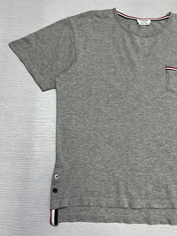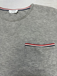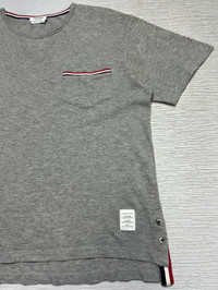 Thom Browne - Chest Pocket Short Sleeve T-Shirt Tagged Size: 1, fits XXS-XS Color: Grey Condition: 9/10 Measurements in Inches(Laid Flat): Shoulder Width: 18” Width: 20” Sleeve Length: 7.5” Length(Front): 21” (Back): 22.5” Details: •Light Grey Crewneck Tee •Medium-Weight Jersey Cotton •Tricolor-Tipped Chest Pocket •Short Sleeve •Thom Browne 4-Bar Tag •Signature Grosgrain Loop Tab •Striped Dropped-Back Button Vents