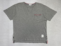 Thom Browne - Chest Pocket Short Sleeve T-Shirt Tagged Size: 1, fits XXS-XS Color: Grey Condition: 9/10 Measurements in Inches(Laid Flat): Shoulder Width: 18” Width: 20” Sleeve Length: 7.5” Length(Front): 21” (Back): 22.5” Details: •Light Grey Crewneck Tee •Medium-Weight Jersey Cotton •Tricolor-Tipped Chest Pocket •Short Sleeve •Thom Browne 4-Bar Tag •Signature Grosgrain Loop Tab •Striped Dropped-Back Button Vents