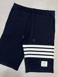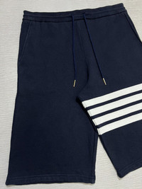 Thom Browne - Classic Loopback 4 Bar Sweatshorts Size 2, fits 30-32 Gently Used Good Condition Normal Sign of Use No major flaws, just washable dirts and lints. No Inclusion Measurements in Inches(Laid Flat): Waist: 15” Front Rise: 13” Hip: 18” Thigh: 12” Length: 22.5” Inseam: 11” Leg Opening: 10” Details: - Leisurewear made artful. Our Classic Loopback 4-Bar Sweatshorts is adorned with our iconic 4-Bar stripe detailing emulated after varsity stripes. Drawstring waistband with silver tone aglets. Engineered 4-bar stripe detail at left thigh. Name tag applique above left cuff. Slip side pockets. Single back welt pocket. Signature striped grosgrain loop tab at back waist. 100% Cotton. Made in Japan.