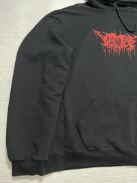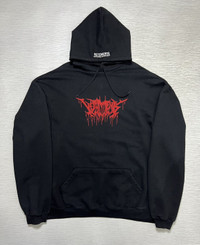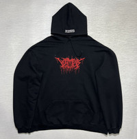 Vetements - Fall-Winter 2018 - Metal Tour Hoodie Tagged Size: Large Gently Used Good Condition *Sign of Use/Flaws(The previous owner put some color enhancer but it turns out to be uneven that’s why some parts are darker than it’s usual color. Minor uneven fade. Lints.) Measurements in Inches(Laid Flat): Shoulders: 27” Width: 26” Sleeve Length: 27” Length: 30” Details: - From the Winter 2018 Collection. Men's black and vermillion Vetements Metal Tour oversize hoodie with graphic print throughout, embroidered accents at hood, dual entry pouch pocket, rib knit trim and drawstring tie closure at front. •Composition: Main Fabric: 80% Cotton, 20% Polyester. •Made in Portugal