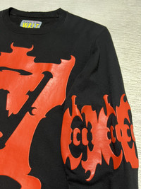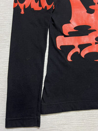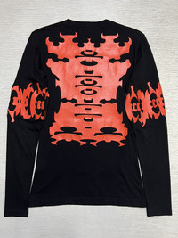 Archive W< - Fall-Winter 1997 - Embossed Tribal Ribcage Metal Logo L/S Shirt Size Medium, fits Small Gently Used Good Condition Normal Sign of Use *Flaws: Repaired small hole on the neckline. Several small bleach stains. Washable dirts. Crack prints. Lints. No Inclusion Measurements in Inches(Laid Flat): Shoulders: 16” Width: 18” Sleeve Length: 27” Length: 26.5”