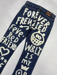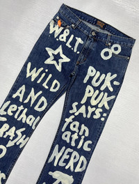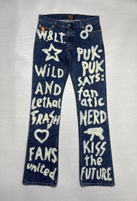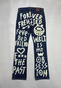 W< by Walter Van Beirendonck - A/W 1999 - Bleach Graffiti Flared Denim Jeans Tagged Size: 28 Color: Denim Condition: 9/10 Material: 100% Cotton No Flaws Made In: Italy Measurements in Inches(Laid Flat): Waist - 14”/28” Front Rise - 8.5” Hip - 17” Thigh - 9” Length - 42” Knee - 7” Inseam - 32” Leg Opening - 8” Manage your expectation and buy with confidence. Take your measurements and know your size because Returns/Refunds are not allowed. Come correct all the time. All sales are final. Please leave your Phone Number and Email Address on the NOTE while making a purchase. Please check my other listings and take advantage of combined shipping rates or special discounts. Thank you very much for your visit.