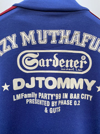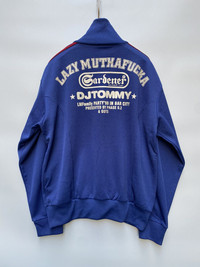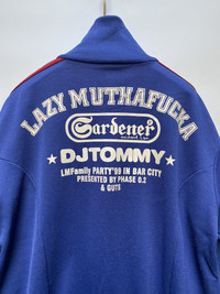 Lazy Mutha Fucka is a Hong Kong-based hip-hop group founded in 1993. This is an exclusive jacket by DJ Tommy, one of the founding members of the group. The track jacket features the Gardener, Michael Lau who is known to be the "godfather of deisgner toys". In excellent condition Large on tag best fits medium Fits large asian men’s Polyester materials Check pics and measurements