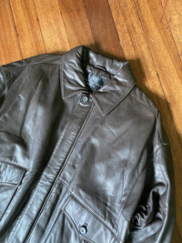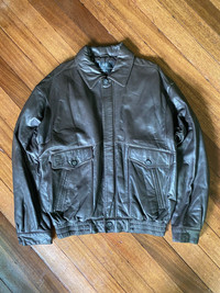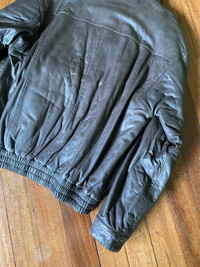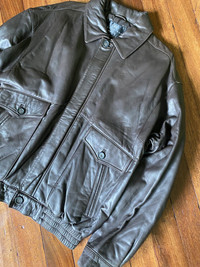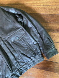 This bomber takes inspiration from 1940s A-2 military leather jacket, hence the 2 big pockets in front. The jacket is made of soft lambskin leather. Dual closure, buttons at the end and a zipper. one of the sleeves has scuff , see last 2 pics for reference. Size 5, fits XL. Check pics and measurments.