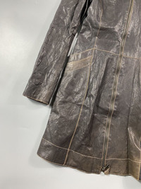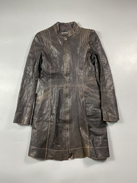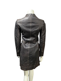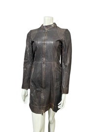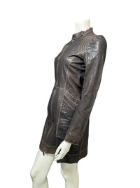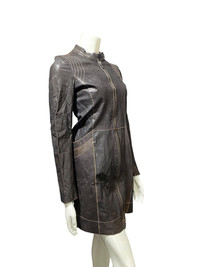 This piece may serve as a jacket or a mini dress. Dark brown leather. Full front zip. Ry zip made in italy. Made in Italy. With zipper on the sleeves Used. Creases are present. General wear. Tagged as size 40 IT Please refer to pics and measurements
