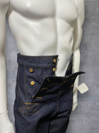 Ultra rare piece from JPG’s Junior Gaultier 1993 Spring Summer Collection. The denim features a tri-closure drop front with buttons as closure. It also features a high waist. The denim is in excellent condition. It has not been used, its just fitted on the mannequin. Creases on the denim are due to storage. Consider it dead-stock. The denim is crisp, 100% cotton. It has hangtag from Onward Kashiyama, the producer of JPG products until 1994. This one is made in Hong Kong. Tagged as 46. The waist is 30” Please be guided with measurements and pictures provided. Please note that this piece is a rare item, as such the price. For reference , one andro jeans was sold in auction for a staggering 14.3k pounds. Heres the link for reference : https://www.kerrytaylorauctions.com/auction/lot/81-a-rare-pair-of-jean-paul-gaultier-mens-ultra-high-waisted-jeans-andro-jeans-collection-spring-summer-1993/?lot=35722&sd=1