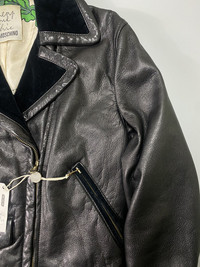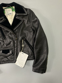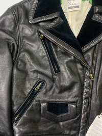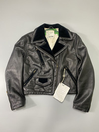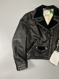 Rare piece!! This biker jacket is made of soft leather with velvet trimmings knitted the pockets and collar. Cropped, this makes it more chic. Vintage lampo zippers. There are zippers on the side of the sleeves. Multiple pockets in front and has small pocket as well. Lining is viscose with print on the information of the item. Tagged as 40. Please check the actual measurements for the fitting. Measurements were taken with the item laid on flat surface. 9/10 condition. Leather quality is amazing. No major flaws. Please check all the details provided including the descriptions, pictures and measurements for smooth transaction. Thanks