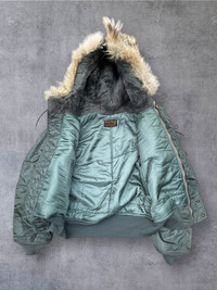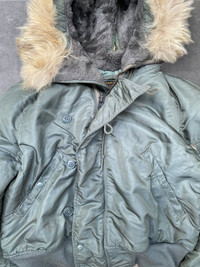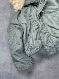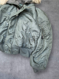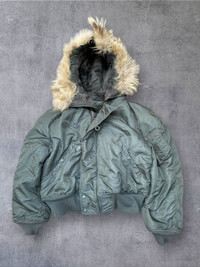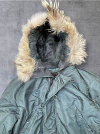 This bomber jacket with real coyote fur belongs to a specific person named Captain T.N. Hatch alongside markings of some specifc bunker name. The markings cant be read well so this is the closest thing i can read on it. Marked 06 as well on the lining. Condition: 8.5/10, in good condition Used, loose stitches on one of the arm rib (see last pic) Year of Production: 1962 Manufacturer: Wisconsin Mfg. Co., Inc Military area: USAF Personnel name: Capt. TN Hatch Type: N-2B with real coyote fur Color: Olive Hardware: Conmar zippers, Rau Fastener buttons Materials: nylon, wool pile, cotton, fur Size: Medium General wear. This was probably used by the captain named above so limit your expectations as this is a vintage military piece. Please be guided with the pictures and measurements provided.