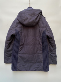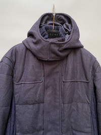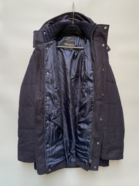 Made in Italy In good condition Size 48, but fits large Wool /nylon materials Navy colorway Lampo zipper With hood. Heavy jacket Check pics and measurements