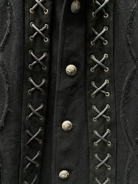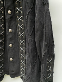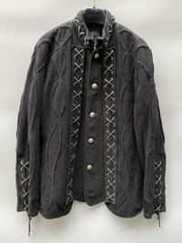 Super rare! As flamboyant as the legendary jazz player, Miles Davis, the jacket features a corset laced jacket from the sleeves to body. The jacket also features a slash-like design that may looked like a jazz notes although the jacket. The lining also features a hand made paint in red which looks like a hands. Back in the late 80s , Miles Davis and Andy Warhol , were friends with Kohshin Sato. He also styled Davis in his concert. Andy Warhol also attended his runway collection. You can find pictures of them online. Size 46 but fits more of like 48 or medium, thats about right fit for miles davis of 5’7” stature. Own a piece of history thehoarder11 thehoarder11 thehoarder11 The jacket is made of 70% wool and 30% cashmere, while the leather trim are 100% cashmere. Check pics and measurements.