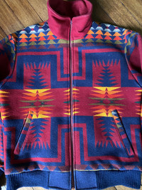 The jacket features a vibrant red wool aztec design. Made in USA. True vintage of the 80s. Medium on tag but fits large. Has small hole on the lining and has signs of wear on the part as pictured. See last 2 pics. thehoarder11 thehoarder11 thehoarder11 Check pics and measurements for reference