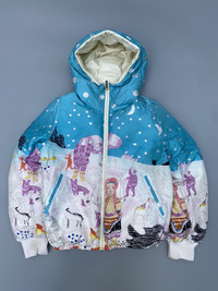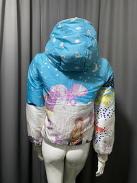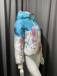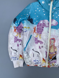 Size 2 on tag Down feather filling Reversible All over print reflecting eskimo living Missing fur on the hood Check pics and measurements