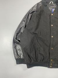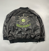 Here’s for all the Rey mysterio fans. A faux leather varsity, with wool and embroidered sun logo as back hit. Tagged as 3XL. In worn condition. The sleeves have a little peeling on the faux leather. A discoloration can also been on the part of the back. Besides that, the jacket is in good condition. Pictures and measurements are provided for you thanks.