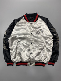Its a sukajan or souvenir jacket made of satin from polyester fabric. Embroidery is insane in its logo on the sleeves and front and back hits. Tagged as large. Minor dot mark and slight stains (see last pics) Acme skateboards was born in 1991 during the peak of skateboarding by Jim Gray. Check pics and measurements.