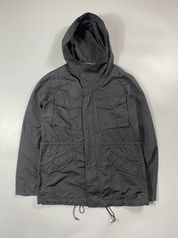 The Viridi-Anne was born in 2001 by the mind of Tomoaki Okaniwa. The brand is known to produce high fashion pieces with avant garde, modern aesthetic. The piece has code of VI-1950-06. The jacket resembles a M-65 military field jacket with the touch of Viridi anne. Made of nylon and polyester blend that went to the process of special dyeing to give a unique quality of garment. It has four pockets in front. It has adjustable laces on the waist and hem. Size 1. Fits small. The shoulders are bit tight for a medium. In good condition. General wear like creases. Has yellowing on the lining. No major issues. Please check the measurements as well. Thanks