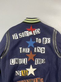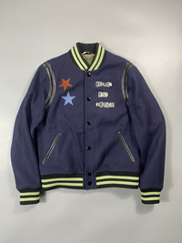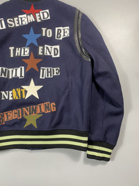 Rare piece from Pierpaolo Piccioli in collaboration with punk legend Jamie Reid in 2017. Made in Italy. Its a teddy jacket with main body as wool. Has leather shoulder trim. Camo lining made of cotton and polyester blend. In excellent condition. No issues. Tagged as 46 but best fits 48. Please Refer to measurements just to be sure on the fit. Thanks