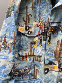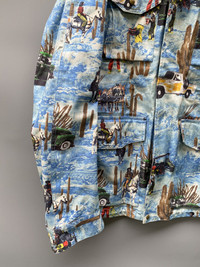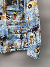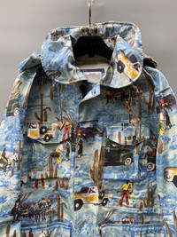 This jacket, named the P.F.D. JKT 3l GORE-TEX KAPA, features an overall blue colorway and has a variety of vintage-inspired graphics — such as trucks, cacti and the like — interspersed across the GORE-TEX body. Zip-down closure and four frontal pockets finish the jacket with a classic look. Size 2, medium to large Riri zipper Excellent condition Check pics and measurements