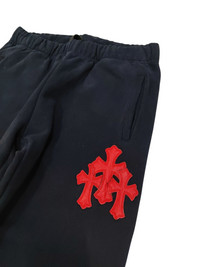 Chrome Hearts Navy & Red Triple Cross Patch Paper Jam Size Small Waist 30 inch can stretch to 36 inch Length 40 inch Emblem missing Great condition # chromehearts