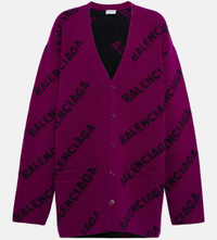 Balenciaga Logo intarsia wool cardigan Size XS. Cardigan sweater is preowned with tags. Was used as display sweater so shows some pills in certain parts of the sweater. Strike thru of brand name on inside label. With this Balenciaga cardigan on hand, layering for cold weather becomes a much more exciting proposition. Made from wool in an oversized silhouette, it's intarsia-knit with the label's scrolling logo. Care instructions: dry clean. Closure: buttoned front. Material: 1% elastane, 1% polyamide, 98% wool. Pockets: slit pockets. Trim: 1% elastane, 2% polyamide, 97% wool. Made in Italy.