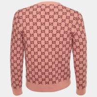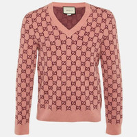 Gucci Pink/Red GG Web Intarsia Wool V-Neck Sweater