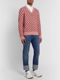 Gucci’s intarsia wool sweater in pink and red reimagines the GG Web in bold colour-blocking. The V-neck cut nods to classic cricket jumpers while the palette keeps it fresh. Wear it over pleated skirts or with dark denim for a preppy-luxe look. Gender Men Composition 95% wool, 5% cashmere Fabric Wool Occasion Casual Size SMALL Color Pink