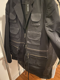 In like new condition. Iconic cargo blazer from consumed collection. Cargo vest is sewn into blazer and features several flapped and zipped pockets. Inside is standard single button blazer with chest and two hand pockets. Hand pockets are still sewn shut. Inside features two pockets with two extra buttons, also still sewn shut. Leather hang patch above the raf simons label. Tagged size 48. Only flaw is care tag info has washed off from a cleaning. Comes with raf simons card tag.