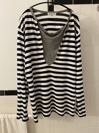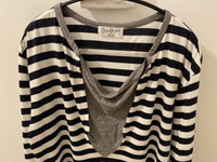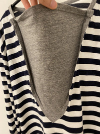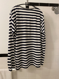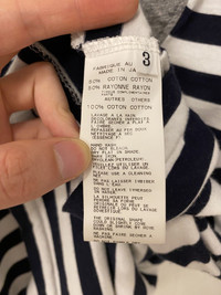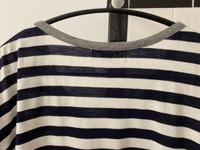 Classic striped shirt with a twist. Features heather grey piping on neck and patch along chest that mimics the look of a bandana. Tagged size 3. No flaws, just general wear.