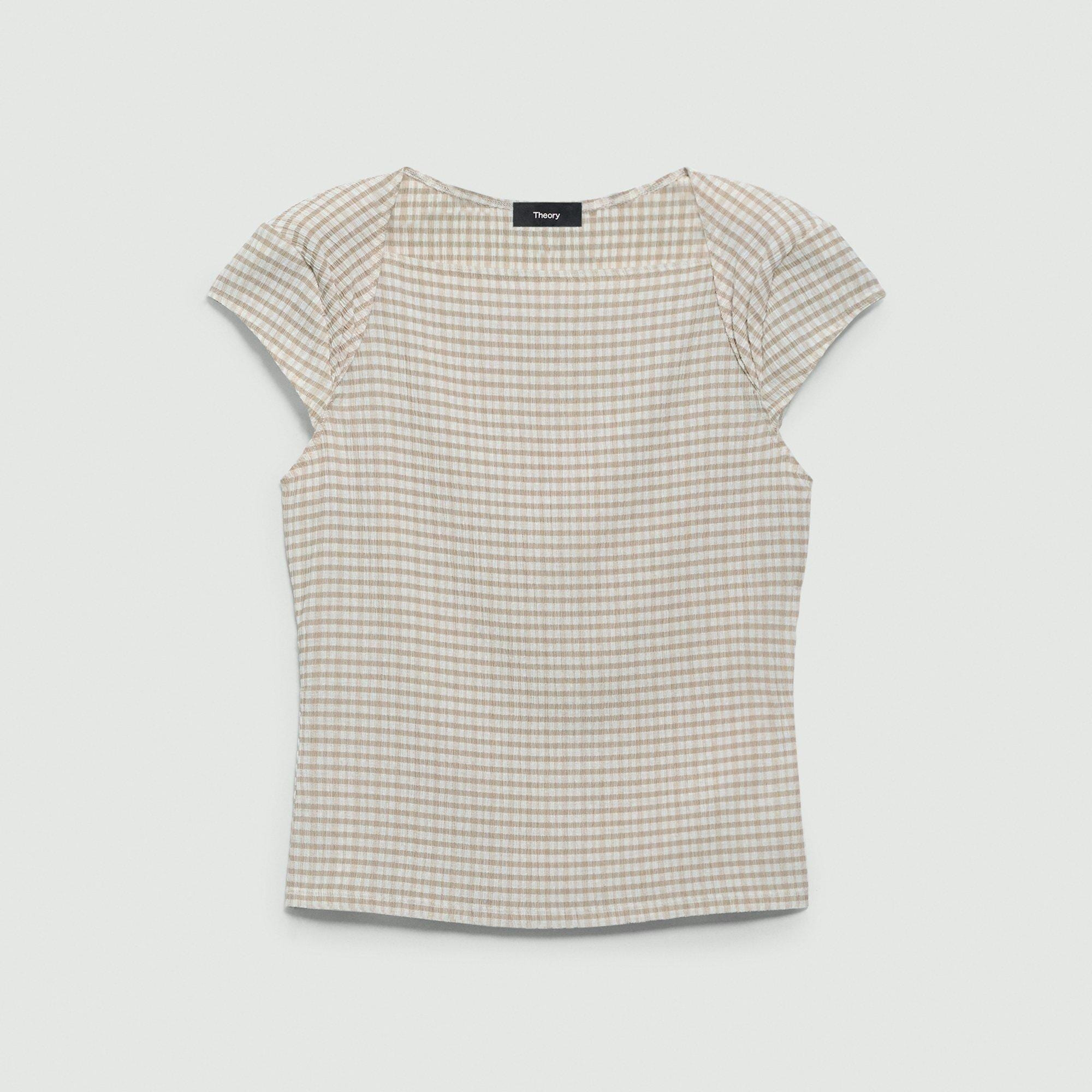 Please enter your email below to be notified when this item is in stock This cap-sleeve top is cut along a square neckline to meet subtly draped detailing at the shoulders. Designed for a slim fit, the silhouette is slightly cropped at a waist length. With a defined crinkle texture, this warp-knit fabric features a two-tone check pattern and is made using a blend of certified recycled polyester. Style #: P0525505 Please enter your email below to be notified when this item is in stock Fit True to size, choose your normal size Slim fit, cap sleeves Short length Model is 5’11” and wearing a US size S Materials & Care Composition 74% recycled polyester 25% cotton 1% spandex Care Do not wash. Do not bleach. Do not tumble dry. Cool iron if needed, light steam if needed. Dry clean with any solvent except trichloroethylene. Imported