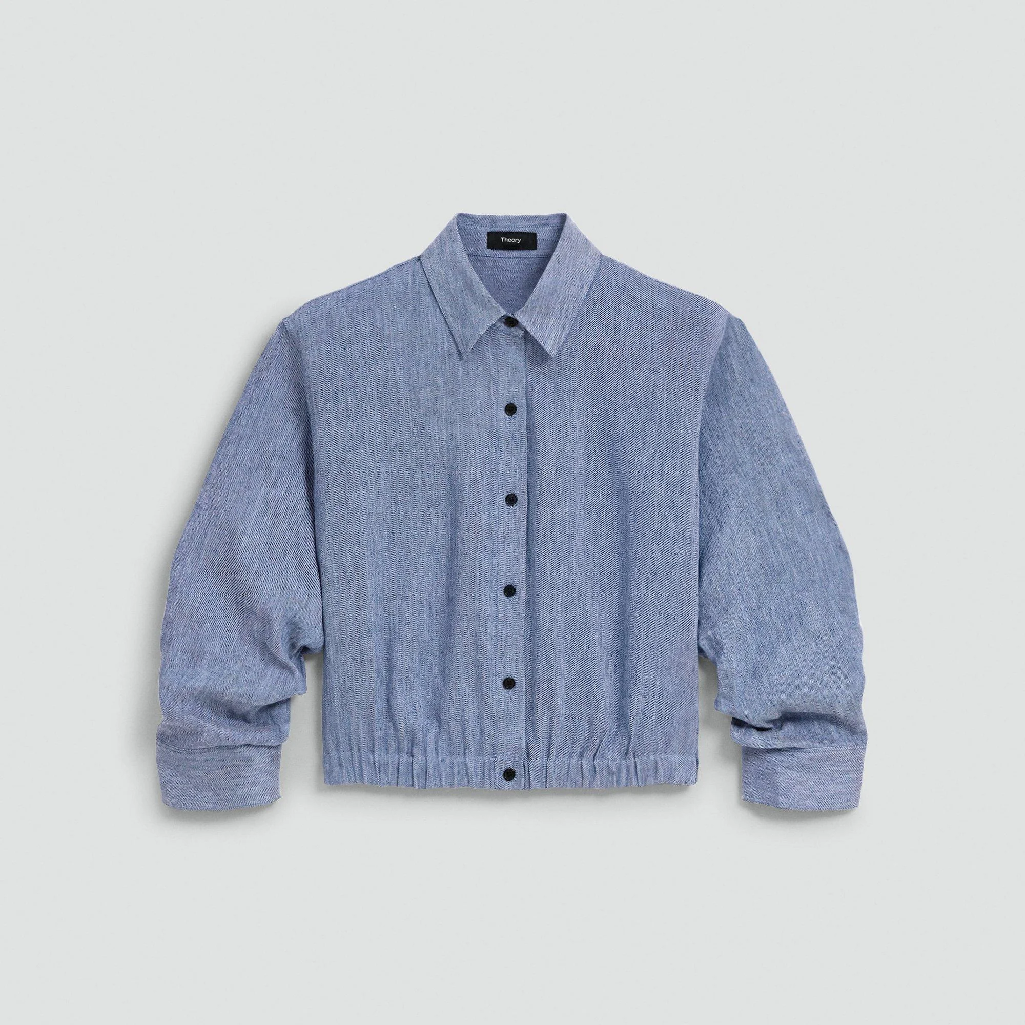 Please enter your email below to be notified when this item is in stock An elevated classic, this button-front shirt is cropped along a straight cut that feels cool yet sophisticated. A pointed collar and three-quarter-length sleeves detail the menswear-inspired silhouette. The fabric is breathable with a classic, denim-inspired look. It’s crafted from certified European sourced flax and viscose made from wood pulp sourced from certified responsibly managed forests. Style #: Q0303521 Please enter your email below to be notified when this item is in stock Materials & Care Composition 54% linen 43% viscose 3% elastane Care Hand wash cold. Do not bleach. Do not tumble dry, hang to dry in shade. Cool iron if needed. Dry clean with any solvent except trichloroethylene. Imported