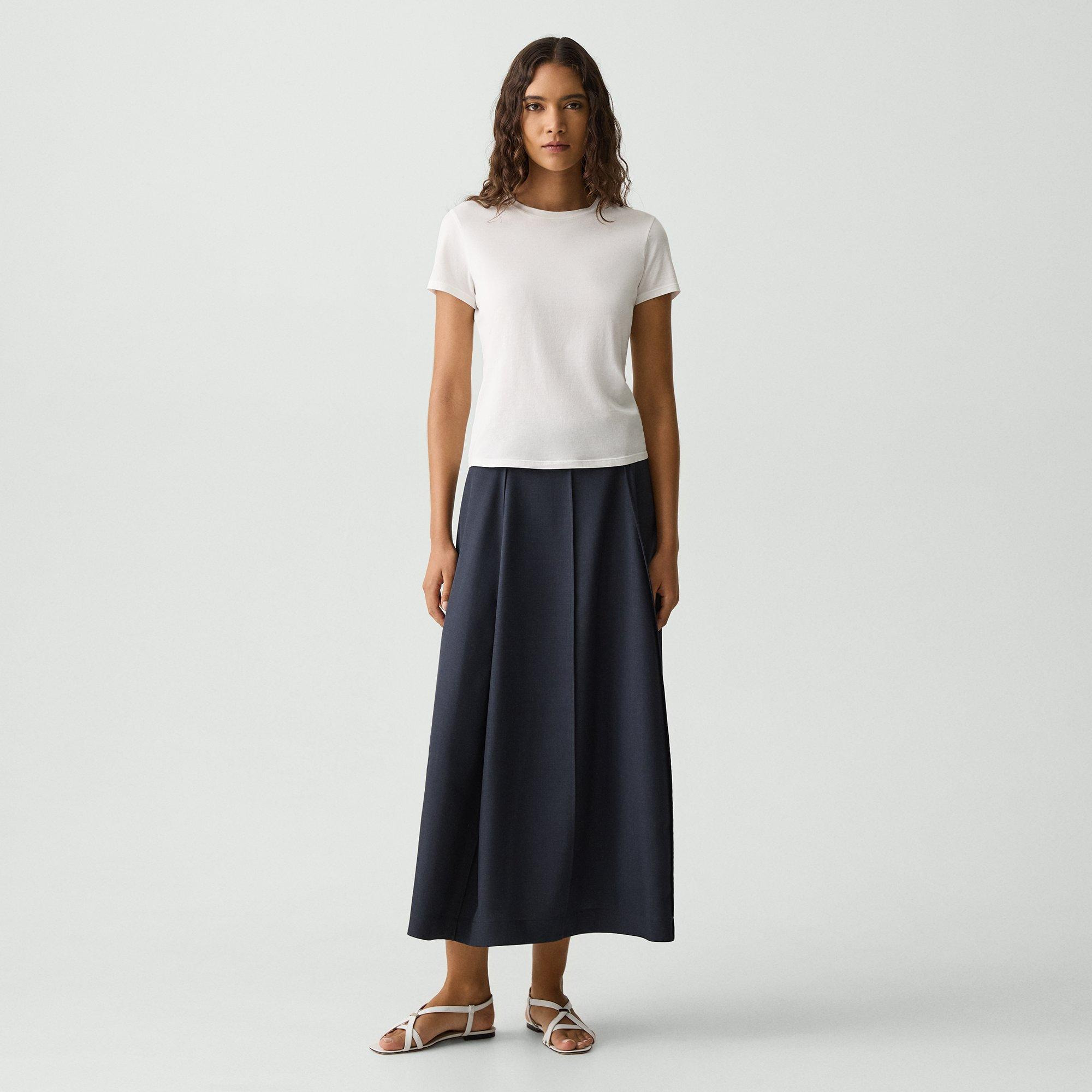 Please enter your email below to be notified when this item is in stock A subtle yet uniquely voluminous flare defines this midi skirt. It’s finished with a straight hem and back zip closure. Produced in Japan, the fabric is woven using a twill construction, perfect for travel and an active lifestyle. It’s wrinkle-resistant and lightweight for superior ease and comfort. Style #: P0605302 Please enter your email below to be notified when this item is in stock Fit True to size, choose your normal size Model is 5’11” and wearing a US size 2 Materials & Care Composition 65% polyester 35% cotton Care Do not wash, bleach, or tumble dry. Cool iron if needed. Dry clean with any solvent except trichloroethylene. Imported.