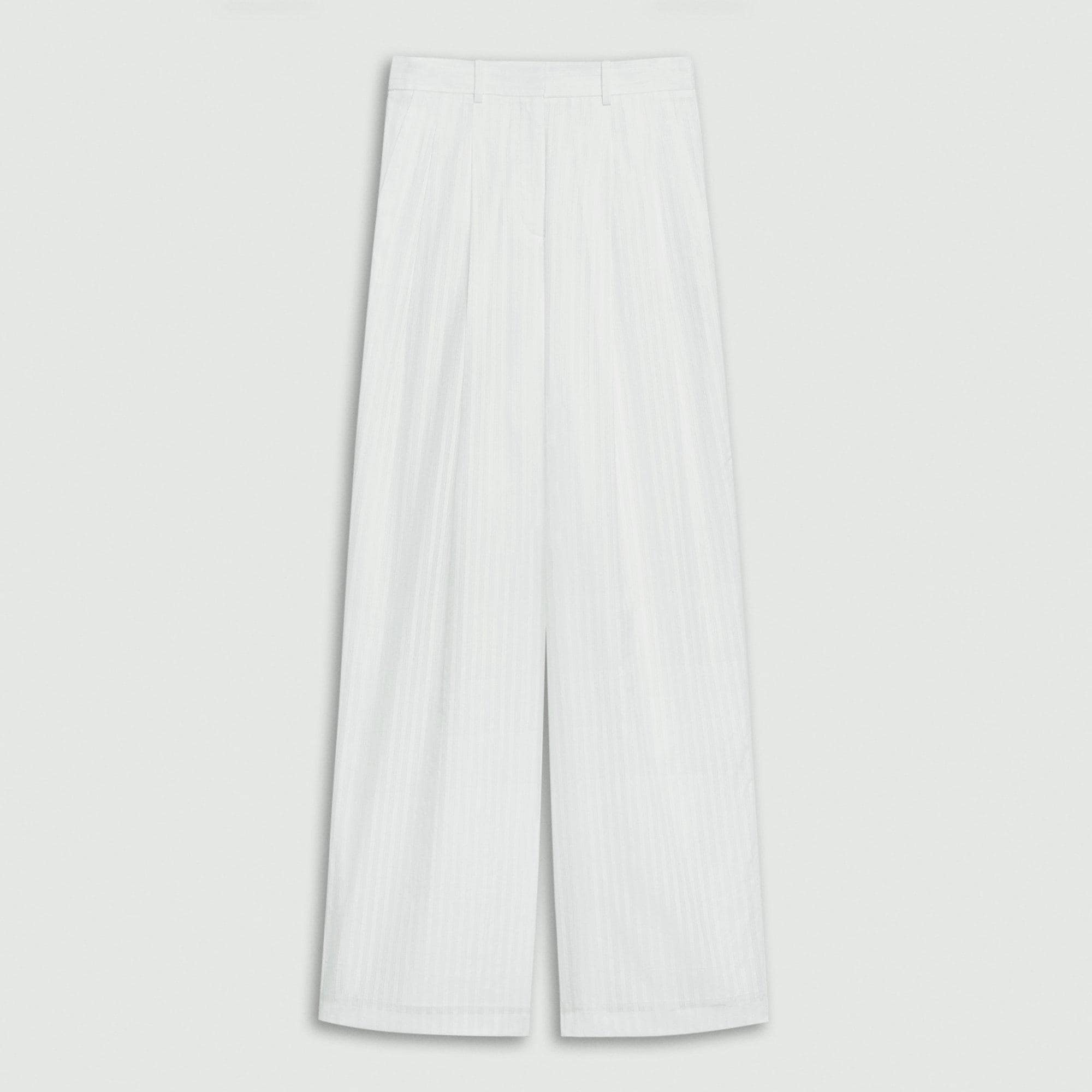Please enter your email below to be notified when this item is in stock Tailored along a high waistline and wide-leg silhouette, this full-length pant is punctuated with pleated detailing for an elevated look. It’s crafted of a cotton semi-sheer shirting fabric with a tonal stripe pattern that plays with transparency, perfect for the warmer months of the year. Style #: P0404202 Please enter your email below to be notified when this item is in stock Fit True to size, choose your normal size High rise, wide leg Full length Model is 5’11” and wearing a US size 2 Materials & Care Composition 100% cotton Care Do not wash. Do not bleach. Do not tumble dry. Cool iron if needed. Dry clean with any solvent except trichloroethylene. Imported