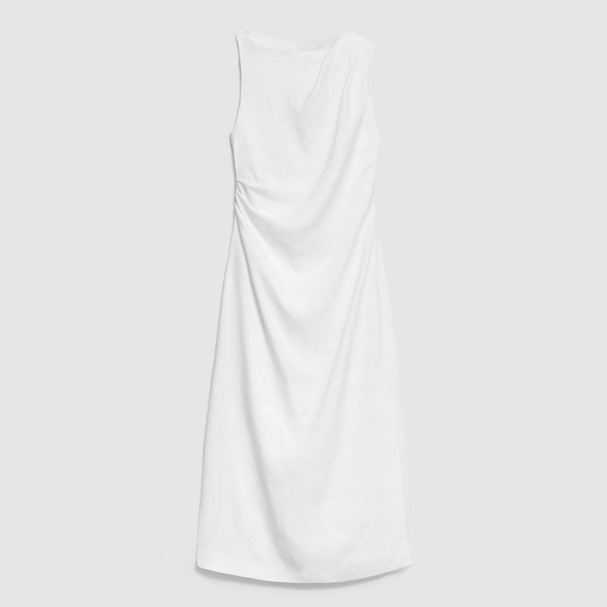 Please enter your email below to be notified when this item is in stock Accented with a neatly draped effect at the shoulder, this slim-fitting dress reaches an elegant midi length with a boat neckline and back zip closure. It is cut from an elevated stretch twill produced by a leading mill in Montemurlo, Italy using flax sourced from Europe and blended with viscose made from certified responsibly sourced wood pulp. Style #: P0403603 Please enter your email below to be notified when this item is in stock Fit True to size, choose your normal size Slim fit, sleeveless Midi length Model is 5’11” and wearing a US size 2 Materials & Care Composition 52% linen 45% viscose 3% elastane Care Do not wash. Do not bleach. Do not tumble dry. Cool iron if needed. Dry clean with any solvent except trichloroethylene. Imported