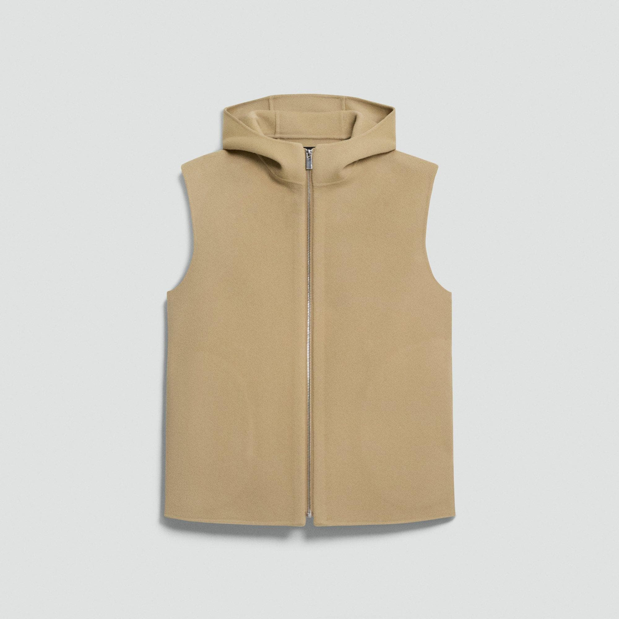 Please enter your email below to be notified when this item is in stock Designed with a hood and high collar, this vest comfortably zips up the front. Wear it over a lightweight knit or a long-sleeve tee—a versatile option for easy layering. Double-face fabrics are created through a special weaving process that joins two layers of a material in which the most luxurious sides of the fabric face outward. Due to their unique construction, double-faced garments are seamed together with special techniques that result in a clean, refined finish. This elevated process—along with the fabric's superior warmth—allows the garments to be unlined. This fabric is made in Italy of both pre- and post-consumer certified responsibly sourced wool and recycled cashmere as well as virgin fibers. Style #: P0701401 Please enter your email below to be notified when this item is in stock Fit True to size, choose your normal size Relaxed fit, sleeveless Short length Model is 5’11” and wearing a US size S Materials & Care Composition 90% wool 10% cashmere Care Do not wash. Do not bleach. Do not tumble dry. Cool iron if needed. Dry clean with any solvent except trichloroethylene. Imported