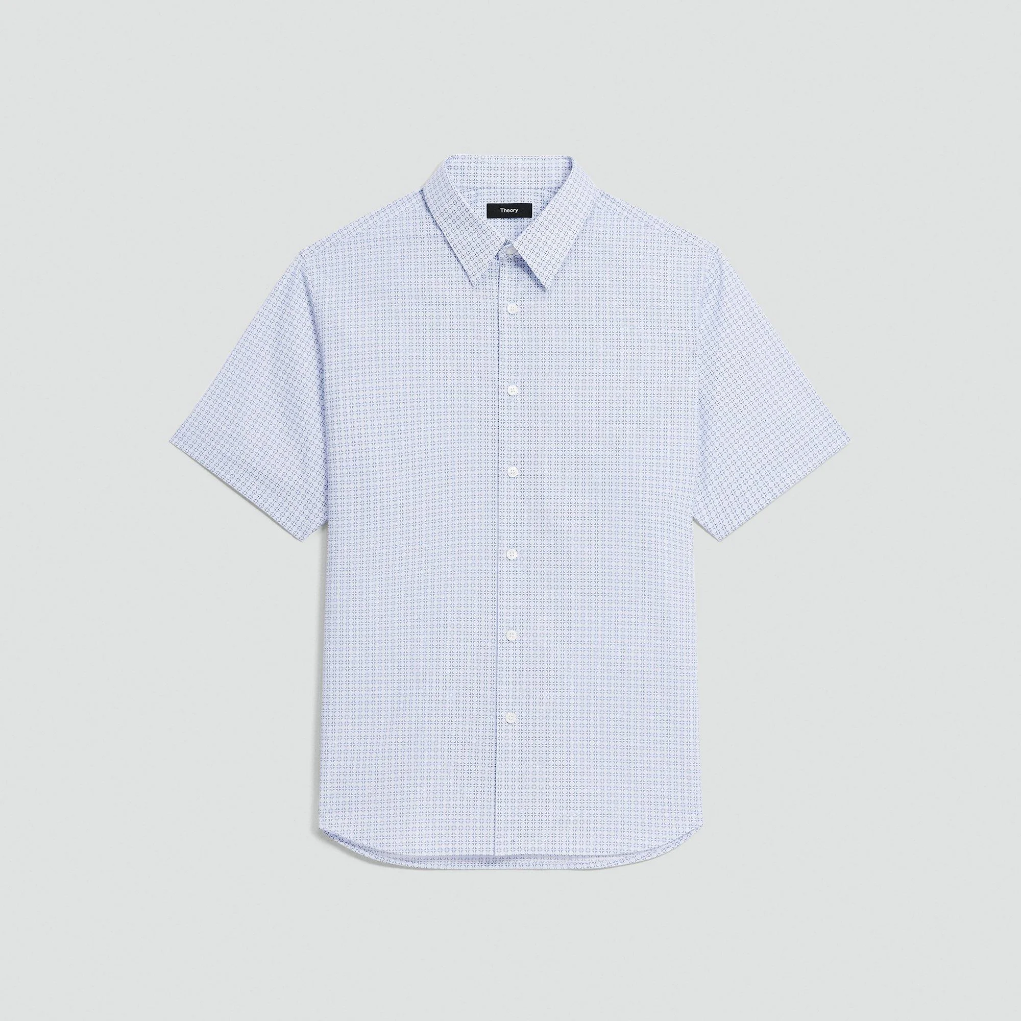 Please enter your email below to be notified when this item is in stock Our short-sleeve Irving shirt is cut for a standard fit and detailed with a point collar, shirttail hem, and button-front closures. A style that feels both casual and modern, this version is crafted from stretch cotton with a subtle geometric print. Style #: P1074507 Please enter your email below to be notified when this item is in stock Fit True to size, choose your normal size Standard fit, short sleeves Materials & Care Composition 97% cotton 3% elastane