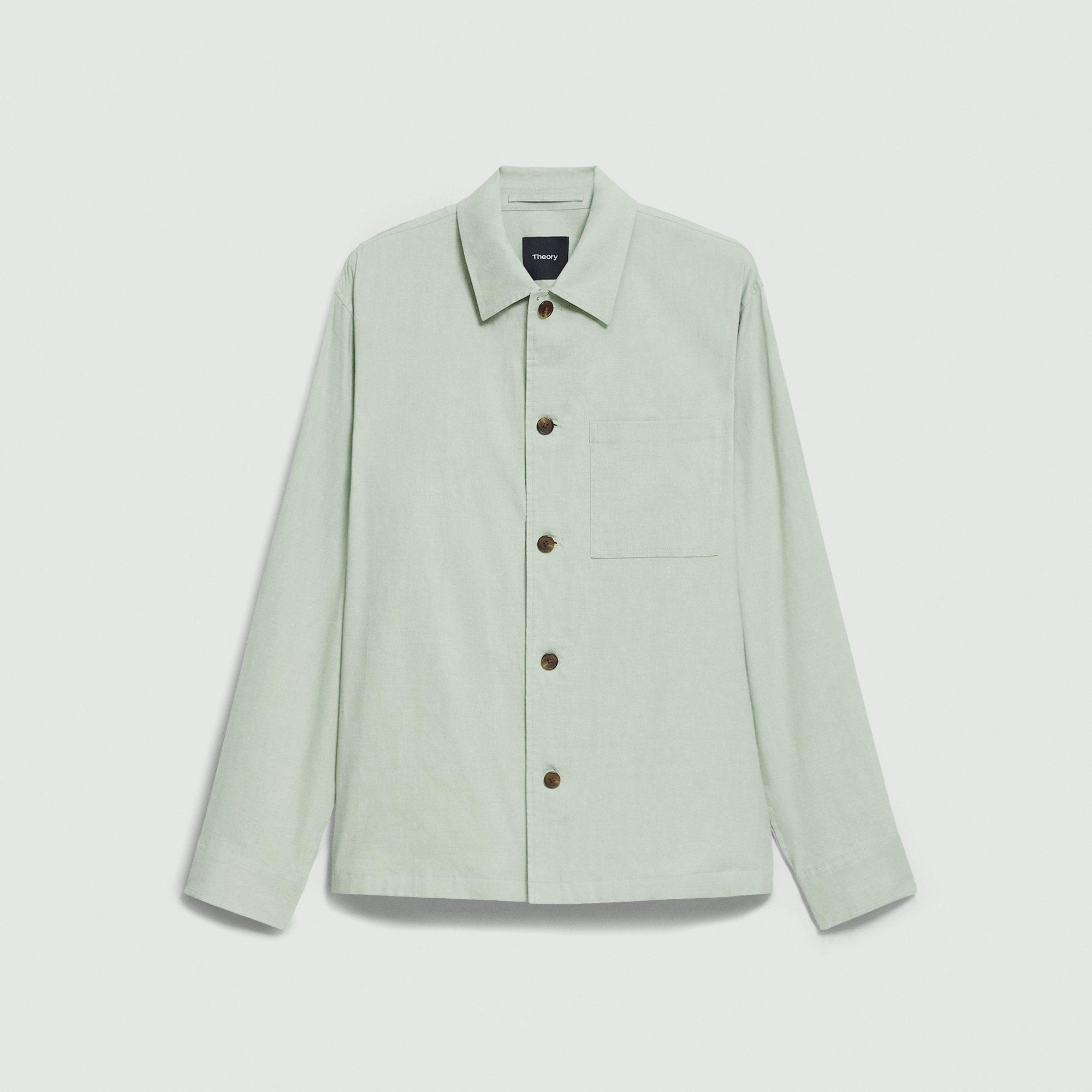 Please enter your email below to be notified when this item is in stock Our versatile overshirt achieves a fine balance between shirting and outerwear. Detailed with a chest patch pocket and adjustable barrel cuffs, the button-front design is crafted in our signature stretch Good Linen. Breathable and lightweight, this is the ideal warm-weather blazer. Theory for Good Woven by the Marini & Cecconi Mill in Prato, Italy, Good Linen is our signature stretch linen fabric, made up of three fibers— flax sourced from France, viscose made from repurposed cotton fiber waste, and certified recycled elastane for stretch. Learn more about our Good Linen. Style #: P0373509 Please enter your email below to be notified when this item is in stock Fit True to size, choose your normal size Relaxed fit, long sleeves Hip length Model is 6’2”, chest 38” and wearing a US size M Materials & Care Composition 62% linen 36% viscose 2% elastane Care Do not wash, bleach, or tumble dry. Cool iron if needed. Dry clean with any solvent except trichloroethylene. Imported.