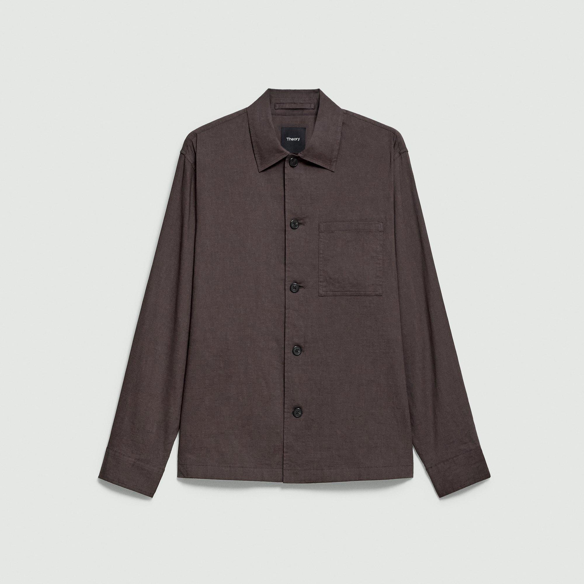 Please enter your email below to be notified when this item is in stock Our versatile overshirt achieves a fine balance between shirting and outerwear. Detailed with a chest patch pocket and adjustable barrel cuffs, the button-front design is crafted in our signature stretch Good Linen. Breathable and lightweight, this is the ideal warm-weather blazer. Theory for Good Woven by the Marini & Cecconi Mill in Prato, Italy, Good Linen is our signature stretch linen fabric, made up of three fibers— flax sourced from France, viscose made from repurposed cotton fiber waste, and certified recycled elastane for stretch. Learn more about our Good Linen. Style #: P0373509 Please enter your email below to be notified when this item is in stock Fit True to size, choose your normal size Relaxed fit, long sleeves Hip length Model is 6’2”, chest 38” and wearing a US size M Materials & Care Composition 62% linen 36% viscose 2% elastane Care Do not wash, bleach, or tumble dry. Cool iron if needed. Dry clean with any solvent except trichloroethylene. Imported.