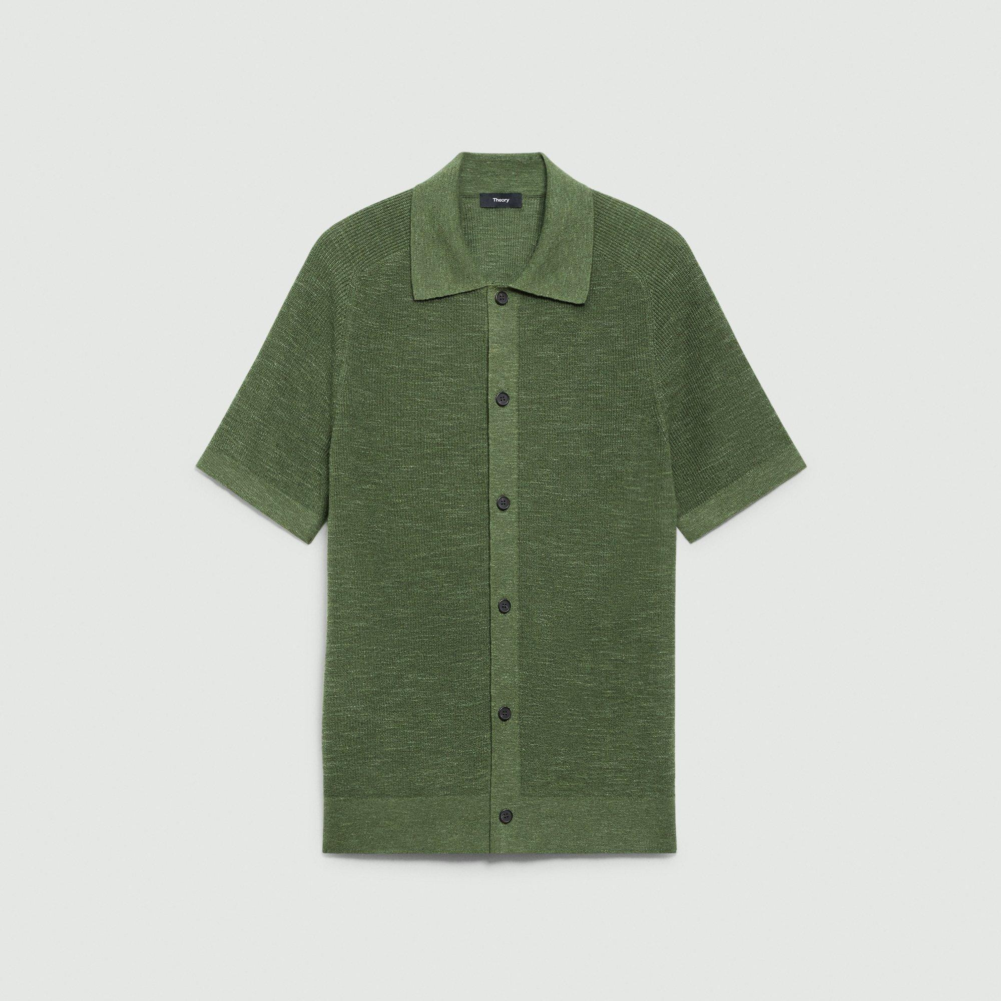 Please enter your email below to be notified when this item is in stock Cut for a standard fit, this short-sleeve shirt is detailed with a spread collar and button-front closures. Cut from a lightweight linen-cotton blend knit in Italy, this style offers breathable comfort with a softly structured feel. Style #: P0583707 Please enter your email below to be notified when this item is in stock Fit True to size, choose your normal size Standard fit, short sleeves Regular length Model is 6’2”, chest 38” and wearing a US size M Discover the best fit for you on our. Materials & Care Composition 65% linen 23% cotton 12% polyester; exclusive of elastic Care Machine wash cold, gentle cycle. Do not bleach. Lay flat to dry in shade. Cool iron if needed. Dry clean with any solvent except trichloroethylene. Imported