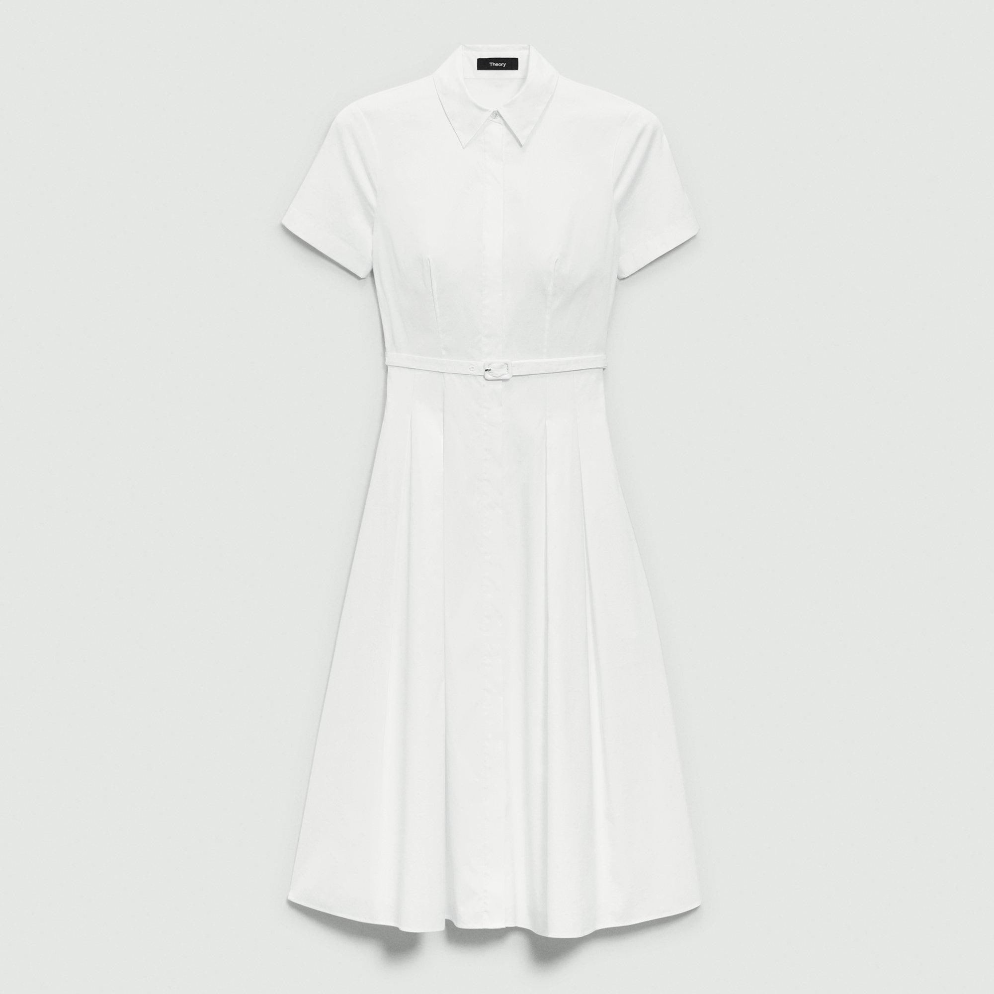 Detailed with a point collar and belted waist, our short-sleeve dress flares into a full skirt that falls just below the knee. Finished with hidden button-front closures, this flattering style is crafted with our stretch Good Cotton that looks crisp and keeps you comfortable year round. Theory for Good Our Good Cotton is made with extra-long staple, American-grown SUPIMA® cotton, which is recognized as one of the softest and most durable cottons in the world. To ensure this cotton is verifiably traceable, we have partnered with Oritain™, which uses forensic science to validate our SUPIMA® cotton from the farm to the mill in Italy where it is responsibly woven into cloth. Learn more about our Good Cotton. Style #: O0204614 Fit True to size, choose your normal size Fit-and-flare silhouette, short sleeves Below-the-knee length Model is 5’11” and wearing a US size 2 Materials & Care Composition 72% cotton 23% nylon 5% spandex Care Do not wash. Do not bleach. Do not tumble dry. Cool iron if needed. Dry clean with any solvent except trichloroethylene. Imported
