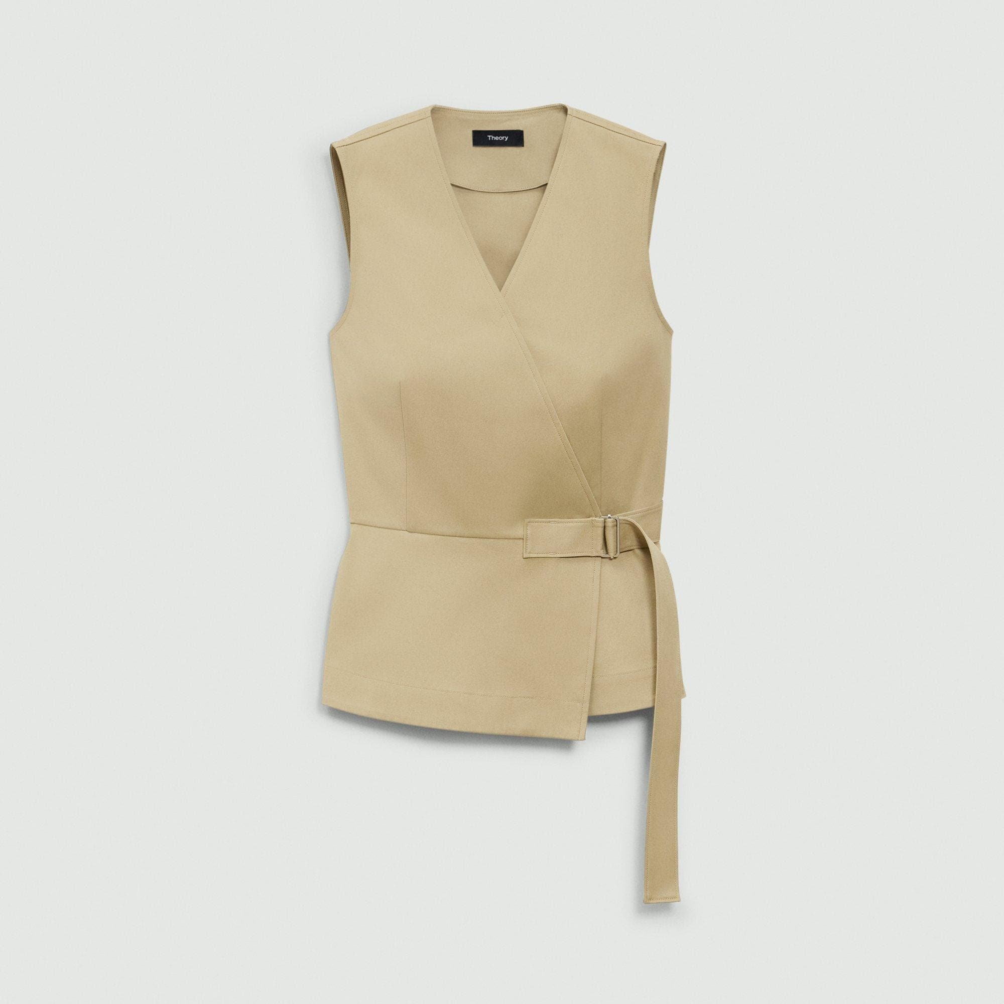 Wrapped at the waist with a buckle detail for an A-line silhouette, this sleeveless top features a V-neckline and smartly curved hem. It’s crafted for a strong, comfortable chino structure that’s mercerized to avoid any shrinkage and give the fabric a slight sheen. Style #: P0204515 Fit True to size, choose your normal size A-line fit, sleeveless Hip length Model is 5’11” and wearing a US size S Materials & Care Composition 98% cotton 2% elastane Care Hand wash cold. Do not bleach. Do not tumble dry, hang to dry in shade. Cool iron if needed. Dry clean with any solvent except trichloroethylene. Imported