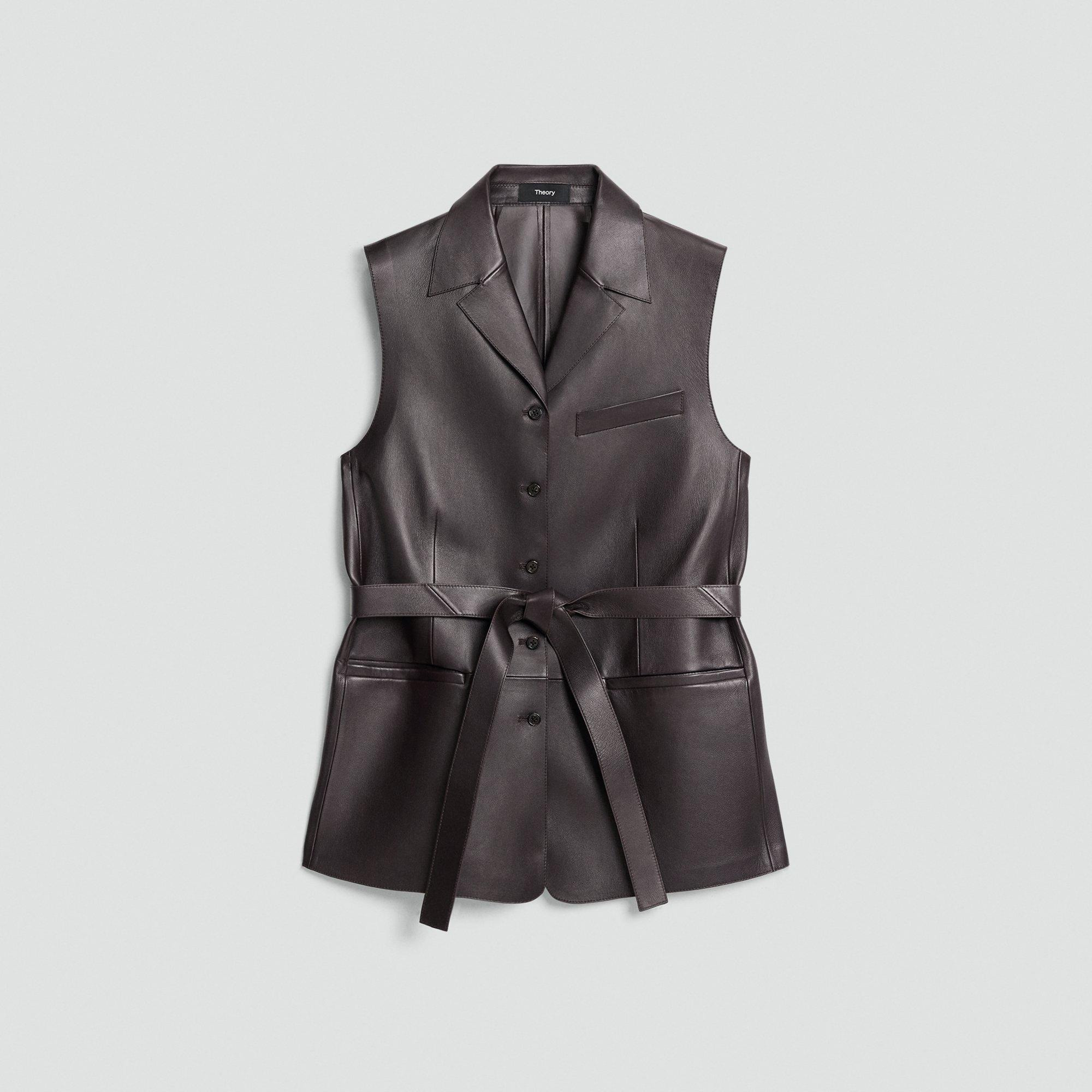 Please enter your email below to be notified when this item is in stock Tied at the waist, our slim vest brings sharp definition to transitional dressing. It’s tailored with notch lapels, besom pockets, and a button front closure. This style is crafted in lamb leather with a smooth, supple finish and natural structure. Layer it over a turtleneck or wear it solo as a bold statement. Style #: P0800121 Please enter your email below to be notified when this item is in stock Fit True to size, choose your normal size Slim fit, sleeveless Short length Model is 5’11” and wearing a US size 2 Materials & Care Composition 100% lamb leather Care Do not wash. Do not bleach. Do not tumble dry. Do not iron. Do not dry clean. Professional leather clean only. Imported