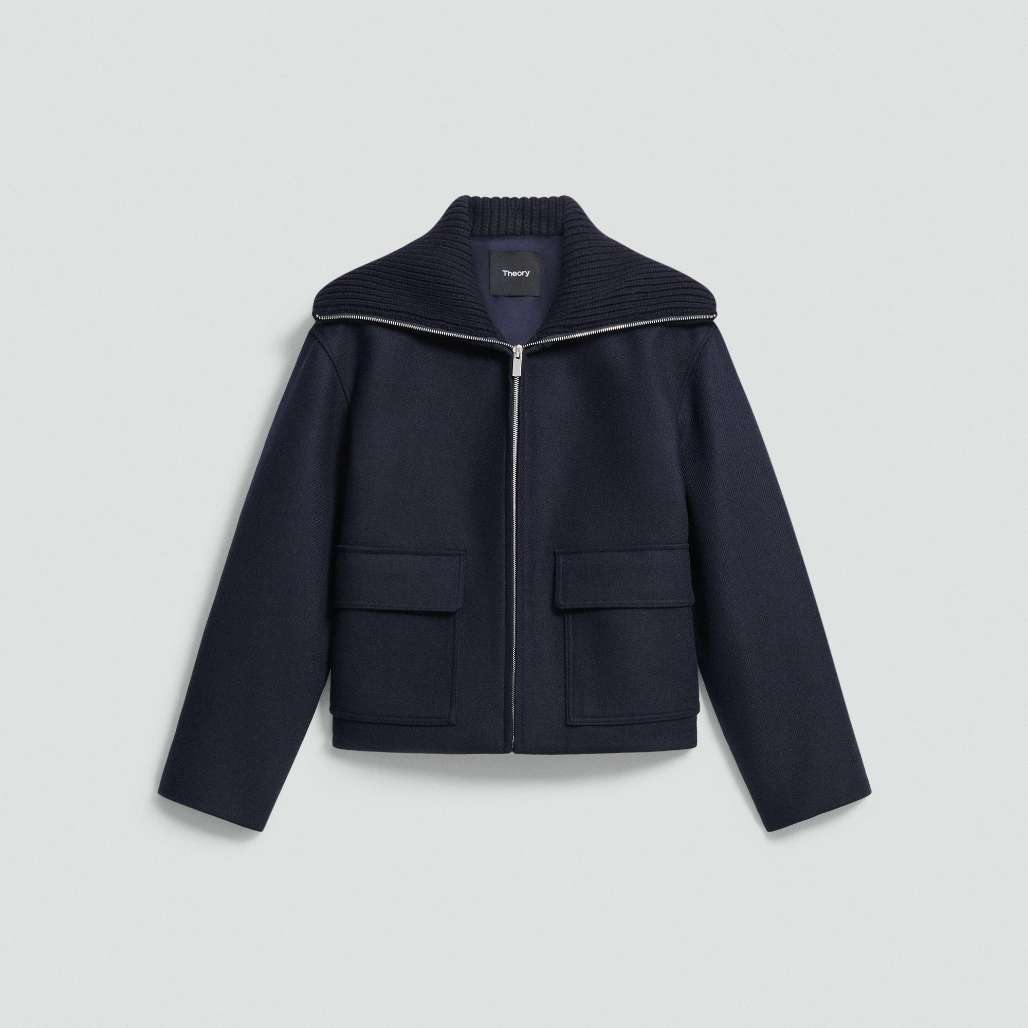 Please enter your email below to be notified when this item is in stock Defined by a wide wing collar and zip front, this jacket balances sharp tailoring with a relaxed ease. Finished with patch pockets and a straight hem, it can be styled open over sleek separates or zipped up for a more sculptural look. Crafted from certified recycled wool and certified recycled polyamide made from consumer waste. It offers both warmth and refinement. Style #: P0901402 Please enter your email below to be notified when this item is in stock Fit True to size, choose your normal size Relaxed fit, long sleeves Short length Model is 5’11” and wearing a US size S Materials & Care Composition shell: 70% wool 29% polyamide 1% acrylic; collar: 100% wool Care Do not wash. Do not bleach. Do not tumble dry. Cool iron if needed. Dry clean with any solvent except trichloroethylene. Imported