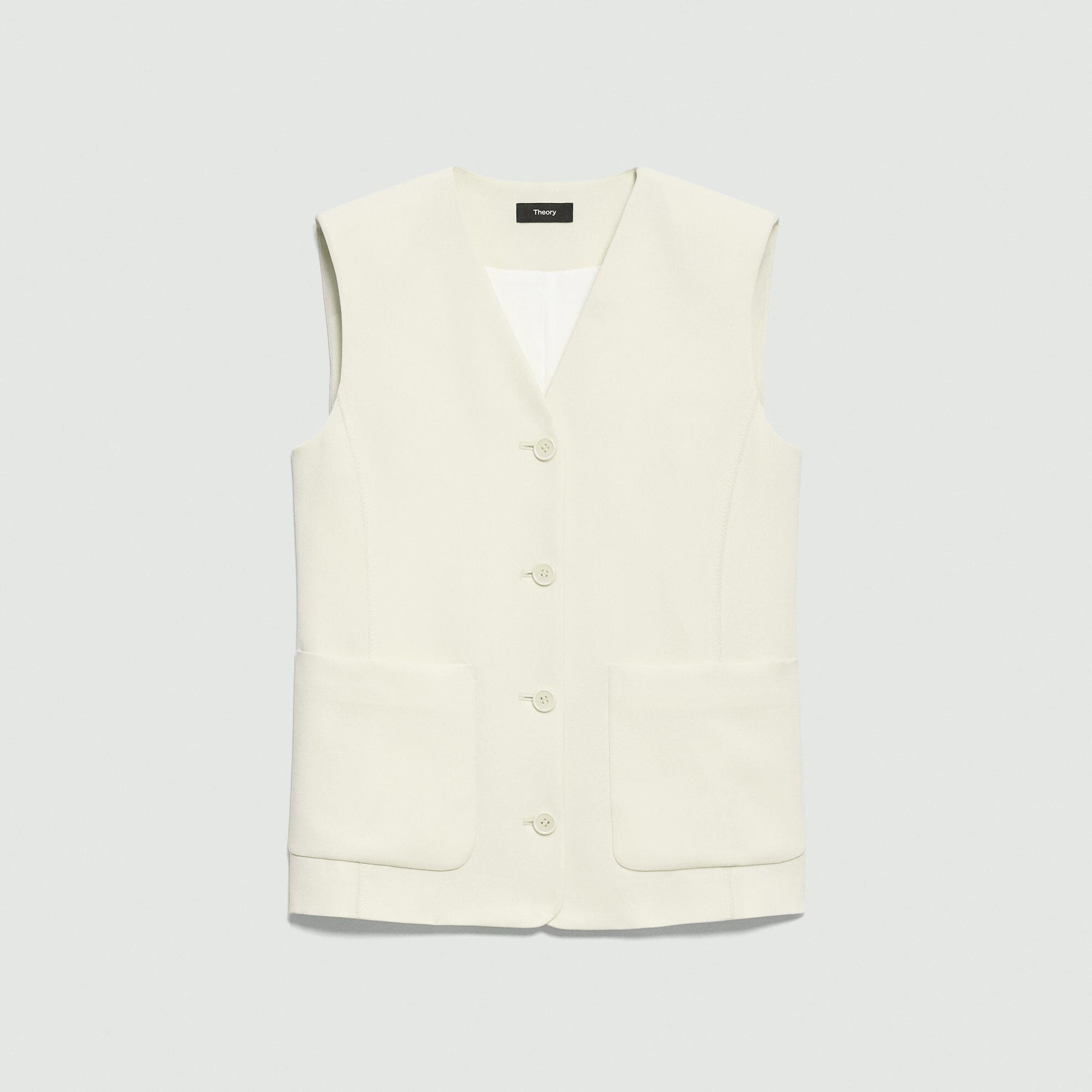 Please enter your email below to be notified when this item is in stock This single-breasted vest features patch pockets and finely stitched detailing along the sides and back. The fabric is specially woven to produce a subtly textured crepe face and a satin weave on the reverse side. Developed in a versatile weight, it has beautiful drape and mechanical stretch with triacetate made from wood pulp and acetic acid. The wood pulp is sourced from sustainably managed forests, and the fiber is manufactured in a responsible manner in Japan. Style #: P0509103 Please enter your email below to be notified when this item is in stock Fit True to size, choose your normal size Relaxed fit, sleeveless Hip length Model is 5’11” and wearing a US size 2 Materials & Care Composition 77% triacetate 23% polyester Care Do not wash. Do not bleach. Do not tumble dry. Cool iron with press cloth if needed. Dry clean with any solvent except trichloroethylene. Imported