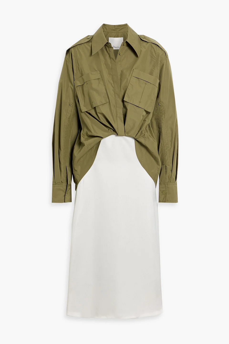 Shirt dress satin cotton-blend poplin paneled draped buttoned cuffs breast pockets partially concealed button fastenings along front concealed zip fastening along side mid-weight, non-stretchy fabric dry clean imported 70% Cotton 30% Polyester Product Code 46376663162942045