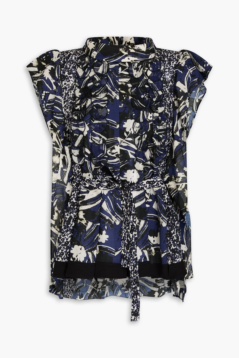Blouse printed silk seersucker appliqued waist ties dipped back hem concealed hook and zip fastening at back lightweight, non-stretchy fabric dry clean imported 100% Silk Product Code 46376663162866145