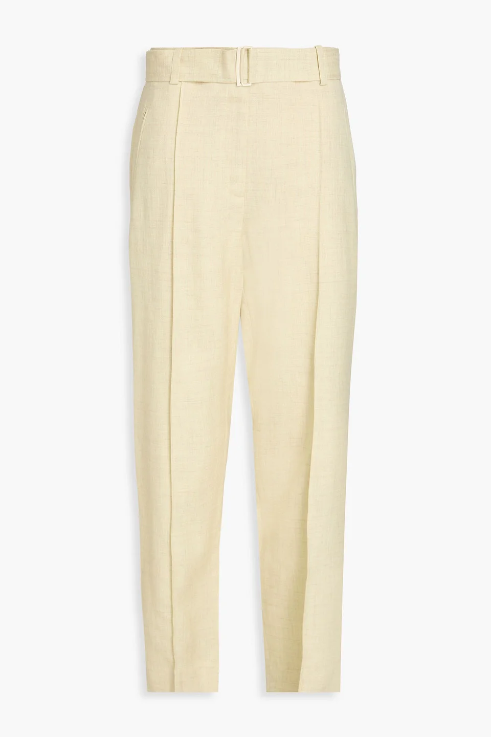 Tapered pants woven stitched front creases detachable belt two side slant pockets two back welt pockets belt loops high-rise cut concealed hook, button and zip fastening at front mid-weight, non-stretchy fabric dry clean imported 86% Viscose 14% Linen Product Code 1647597359249903