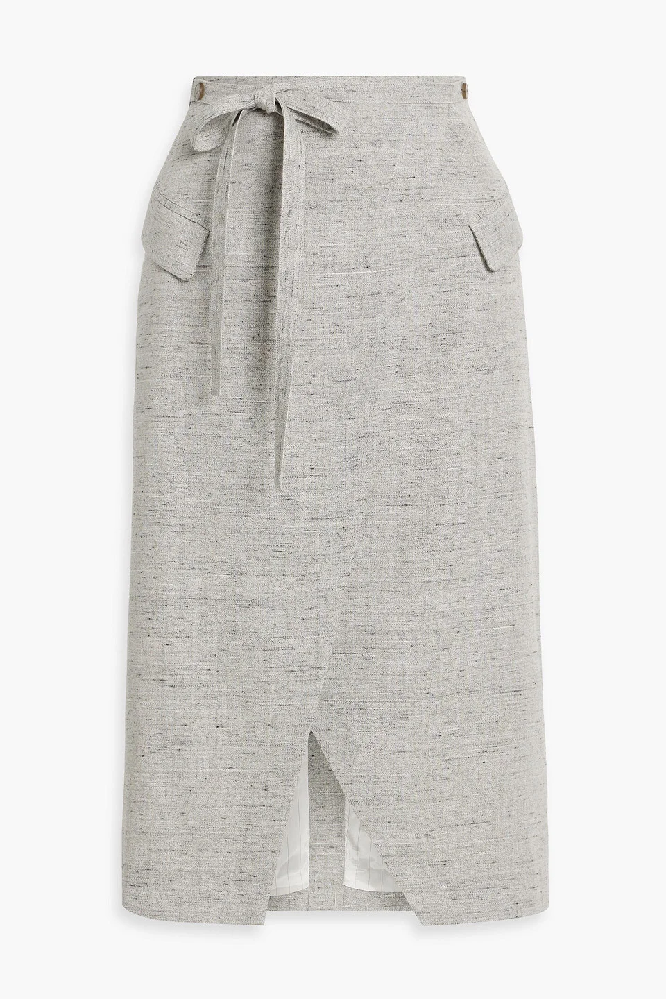 Skirt tweed bow-detailed wrap-effect two front flap pockets front and back splits fully lined concealed hook and zip fastening at back mid-weight, non-stretchy fabric dry clean imported 90% Viscose 7% Linen 3% Polyamide Product Code 46376663162874660