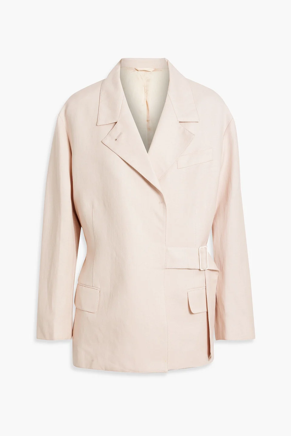 Blazer twill wool and hemp-blend waist belt buttoned cuffs breast pocket two front flap pockets concealed button fastening at front fully lined dual back vents mid-weight, non-stretchy fabric dry clean imported 55% Wool 45% Hemp Product Code 1647597356393944