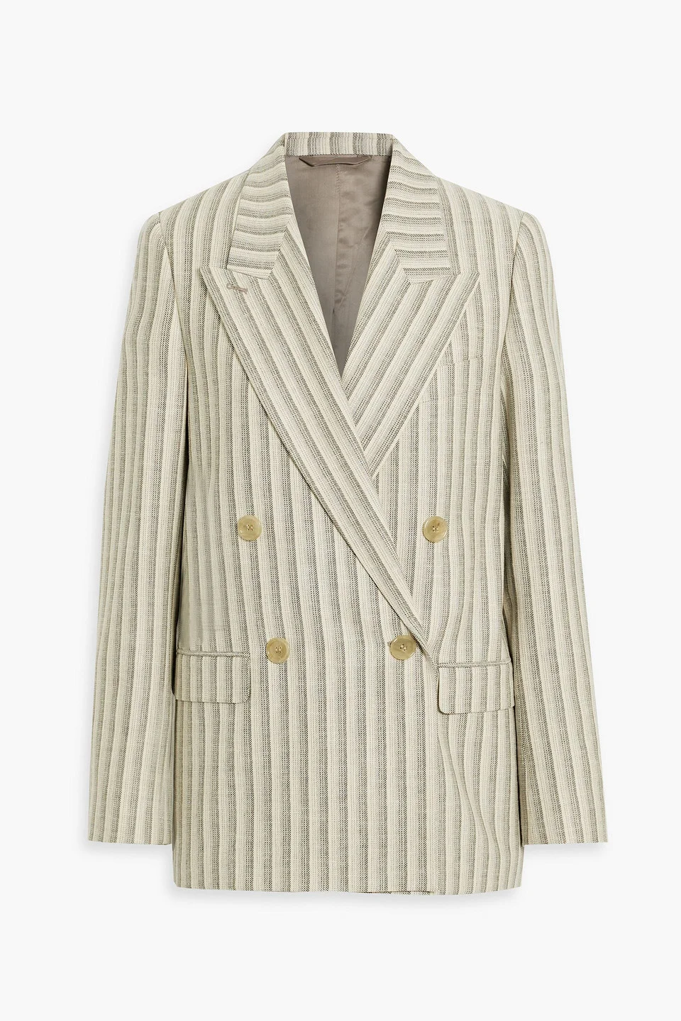 Blazer striped tweed wool and cotton-blend buttoned cuffs breast pocket two front flap pockets button fastening at double-breasted front fully lined back vent non-stretchy fabric mid-weight fabric dry clean imported 80% Wool 20% Cotton Product Code 1647597306799942