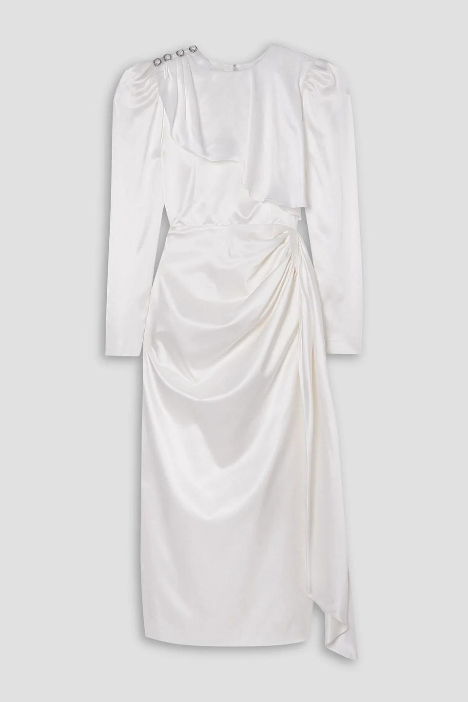 Dress silk-satin faux pearl draped shoulder pads button-detailed zipped cuffs concealed hook and zip fastening at back mid-weight, non-stretchy fabric dry clean made in italy Ideal for a town-hall ceremony, this elegant Alessandra Rich dress is cut from white silk-satin with leg-of-mutton sleeves, a button-detailed overlay and a softly draped, petal-like skirt. Style yours with a veiled headband and simple pumps for a photograph on the front steps. 100% Silk Product Code 1647597299289172